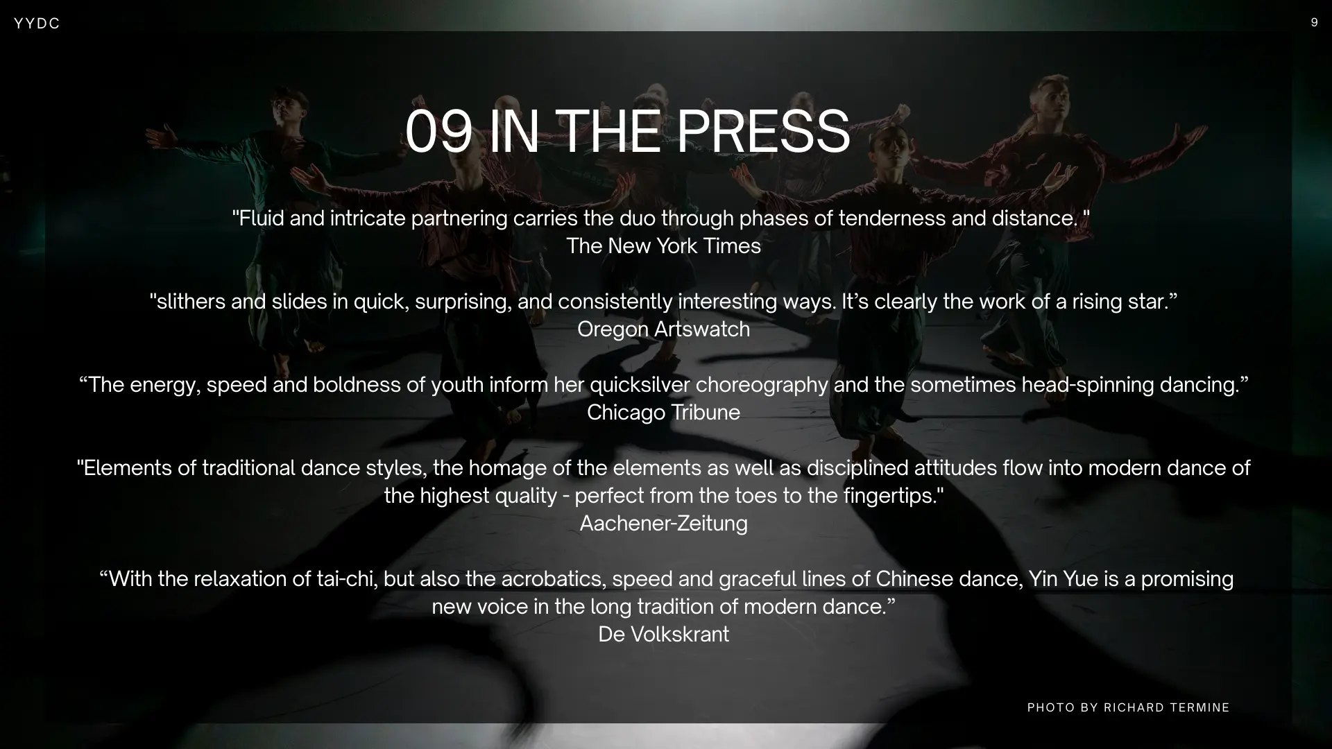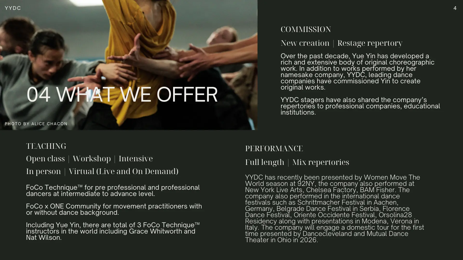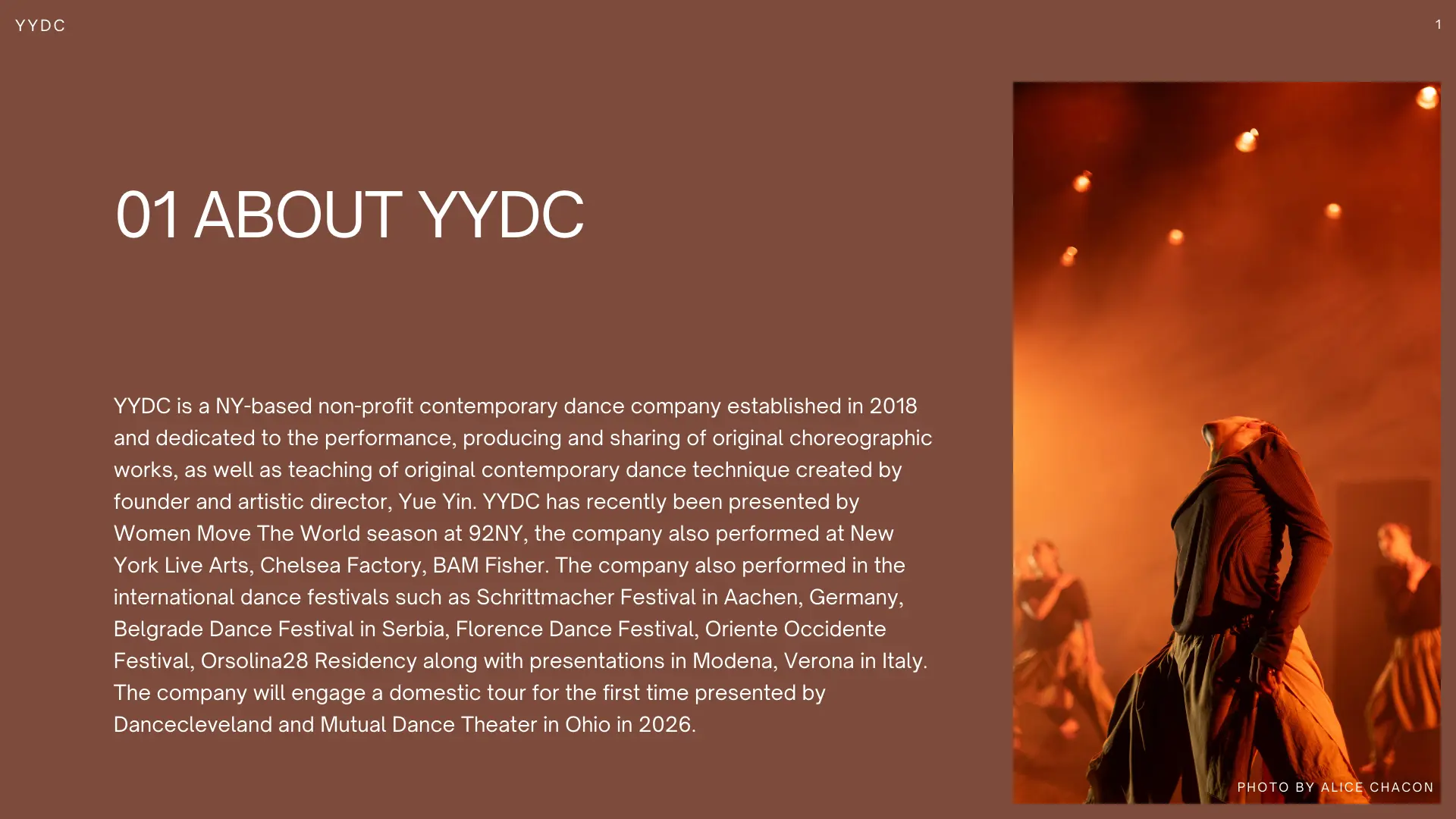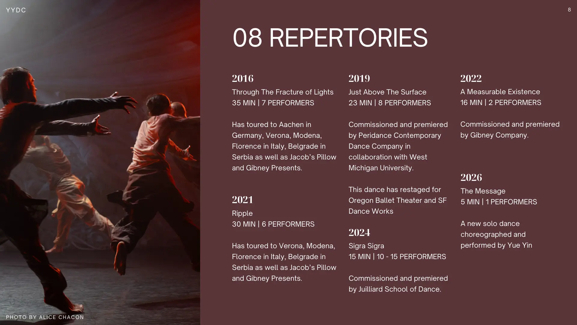 YYDC presents both evening-length works and mixed-repertory programs for theaters, festivals, and international touring contexts. The company has been presented by leading institutions and festivals including 92NY, Jacob's Pillow Dance Festival, Florence Dance Festival, Orsolina28, Oriente Occidente Dance Festival, Belgrade Dance Festival, and Schrittmacher Festival, among others, with performances across the United States and internationally.
