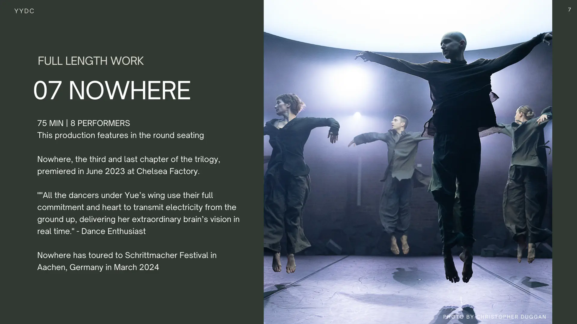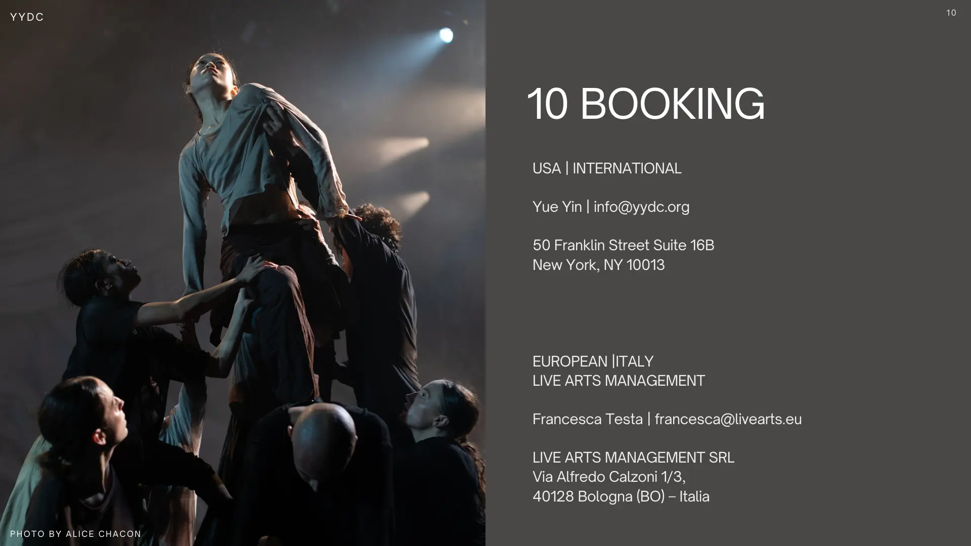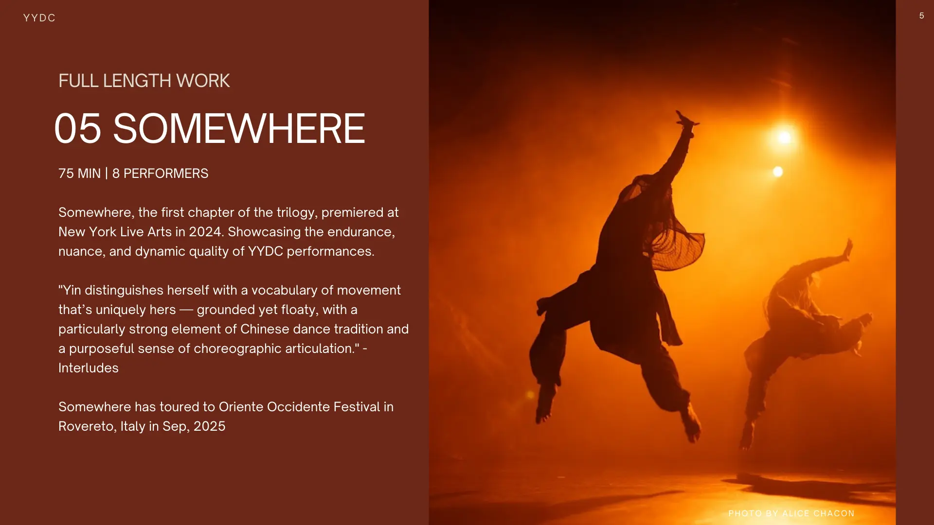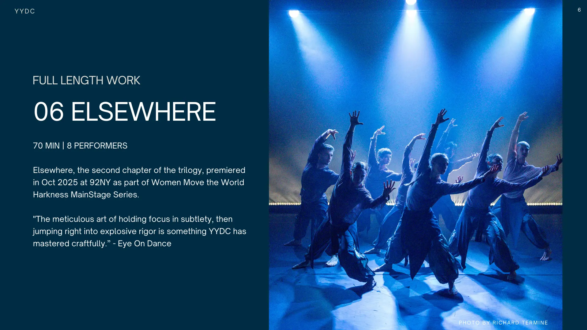 YYDC presents both evening-length works and mixed-repertory programs for theaters, festivals, and international touring contexts. The company has been presented by leading institutions and festivals including 92NY, Jacob's Pillow Dance Festival, Florence Dance Festival, Orsolina28, Oriente Occidente Dance Festival, Belgrade Dance Festival, and Schrittmacher Festival, among others, with performances across the United States and internationally.