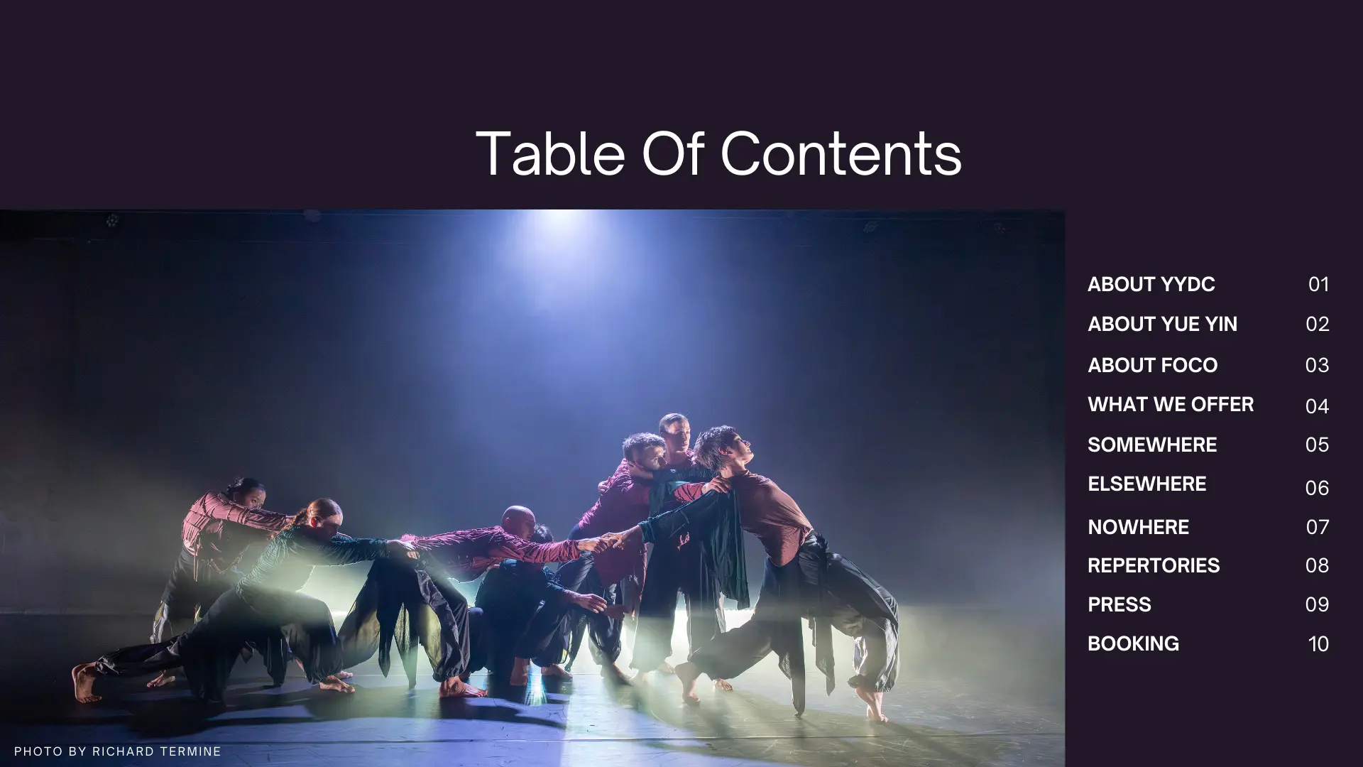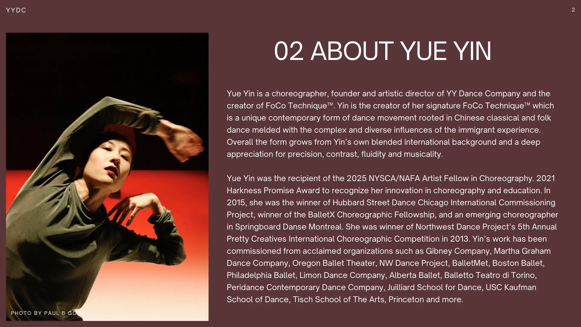 Yue Yin Dance Company (YYDC) is an acclaimed contemporary dance company led by Artistic Director Yue Yin, recognized for its physically rigorous, viscerally expressive movement language known as FoCo Technique®. The company’s work bridges Eastern and Western sensibilities, combining technical precision with raw emotional presence.