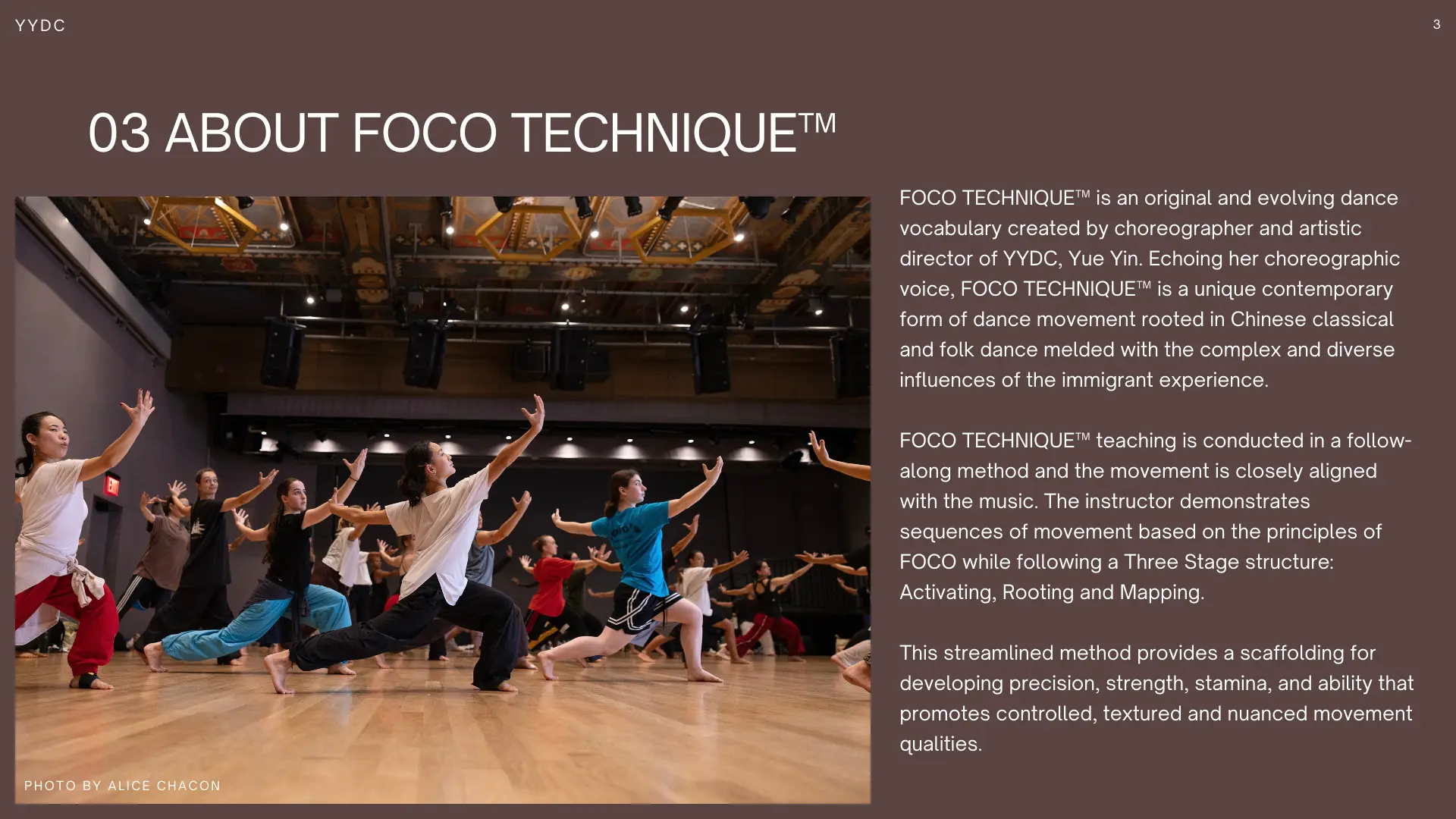 YYDC offers a robust range of teaching and community engagement programs grounded in FoCo Technique®, including master classes, workshops, residencies, and intensives. Programming is designed for professional dancers, pre-professional students, and broader community participants, with offerings that require no prior dance experience. YYDC has led educational and engagement programs in cities across the United States as well as internationally, including Marseille, Paris, Toulouse, Amsterdam, Aachen, Turin and multiple locations throughout the USA.
